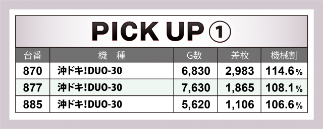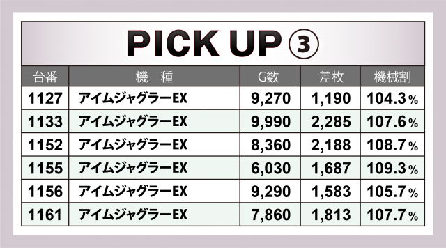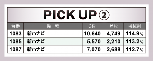 今回、20スロ193台は差枚数トータルマイナスとなった上、1,000overが30台を下回り前回より大幅ダウン。過去負けなし&6連勝を達成していただけに、この黒星は痛い。間もなく訪れるであろう次回取材時には圧倒的なプラスで巻き返しを図ってもらいたいものだ。