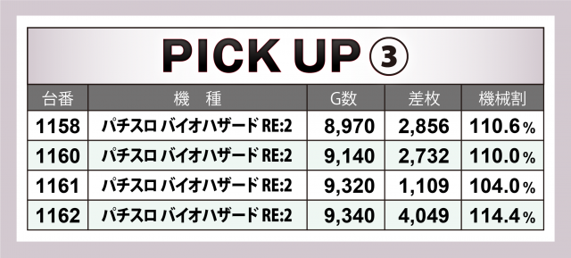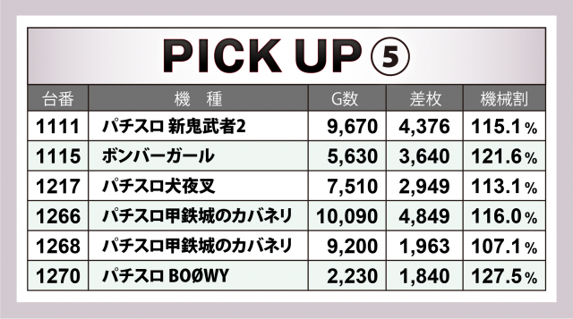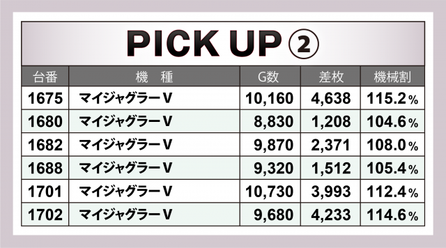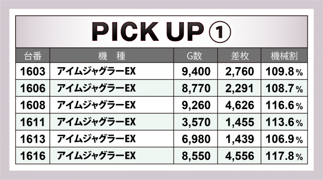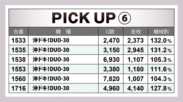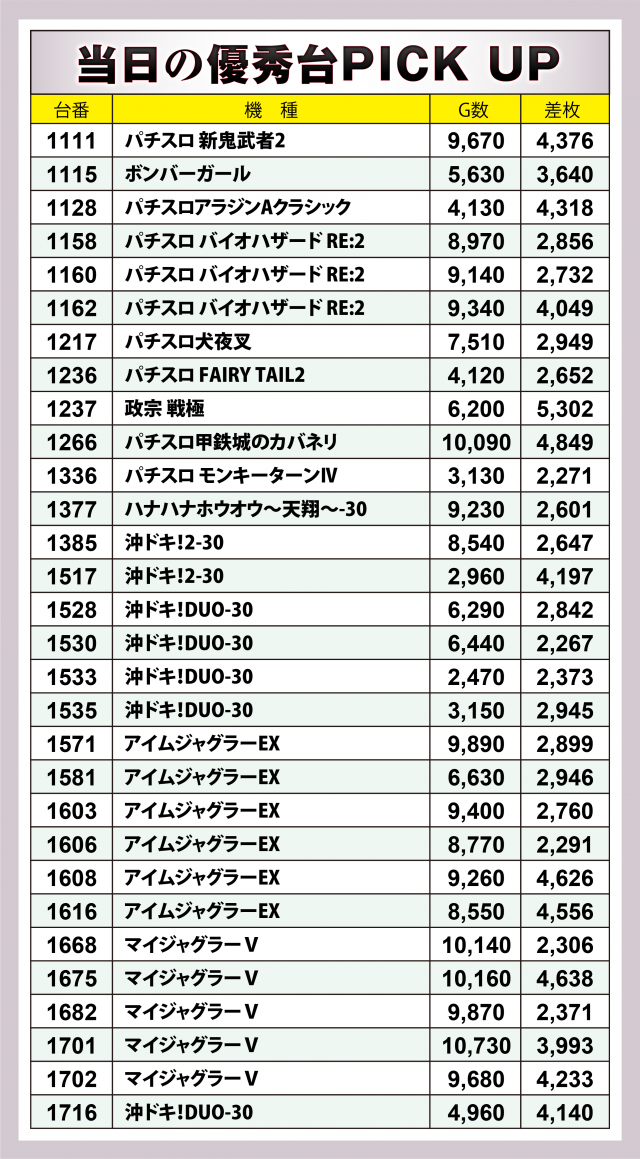 続いては6箇所の好調12機種計34台にズームイン。+4千枚超をマークしたのが『アイムジャグラーEX』『マイジャグラーⅤ』『パチスロ 新鬼武者2』『沖ドキ!DUO-30』の4機種で、中でも『マイジャグⅤ』はボーナスタイプながら+4千枚クラスを3台も輩出する素晴らしい成績でこの日を締めくくった。また上記機種以外にも2~3千枚クラスがゴロゴロという結果に。