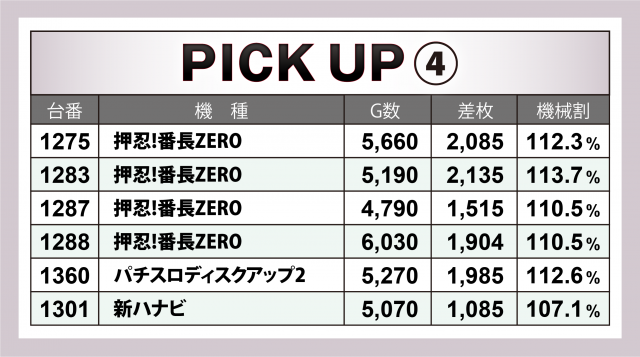 まずは優秀30台のPICK UPから。同店ではおなじみの光景だが30台の全てが差枚数+2千枚以上を達成、+3千枚以上は13台、+4千枚オーバーは11台となった。後述する好調マシン以外では+5千枚を超えた『政宗 戦極』、共に+4千枚を突破した『パチスロアラジンAクラシック』『沖ドキ!2-30』のスコアが一際目を引いた。