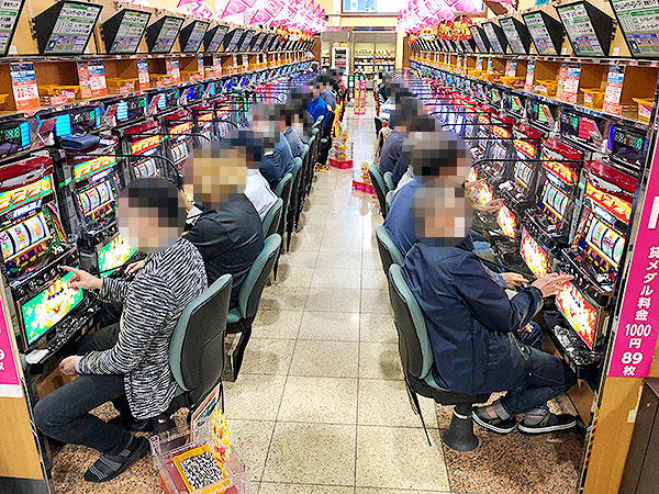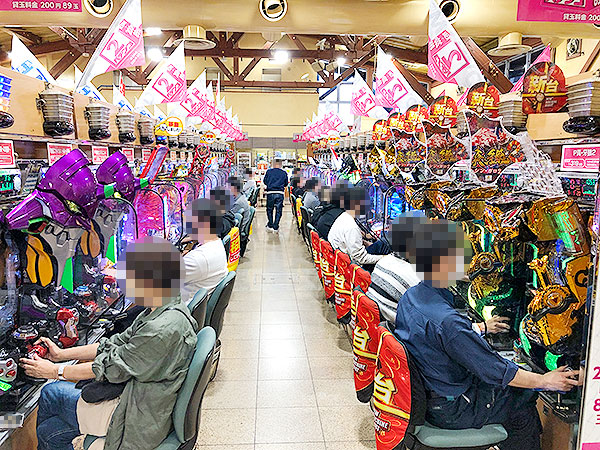 15時半ごろの200円/89玉パチンコをチェックすると「P真・牙狼2」や「新世紀エヴァンゲリオン〜未来への咆哮〜」が盛況の様子。プレイヤーたちの満足気な表情が印象に残っている。