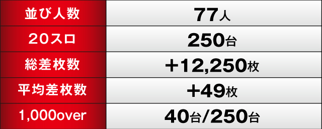 終わってみれば、優秀台にしてピックアップ機種でもある機種たちの活躍によって、トータルの差枚でも+12,250枚を記録。1,000over機種も40台/250台という好結果を残した。この勢いで、次もプラスを勝ち取ろうではないか!