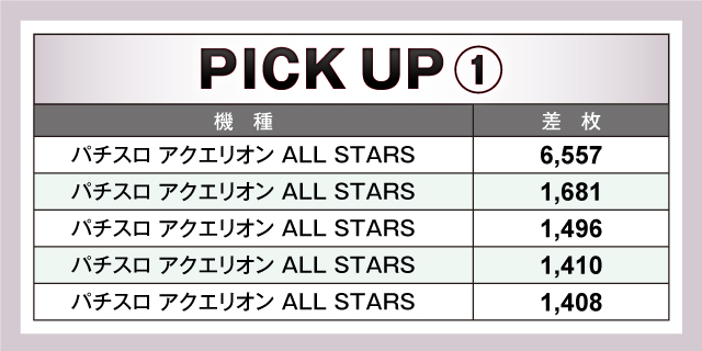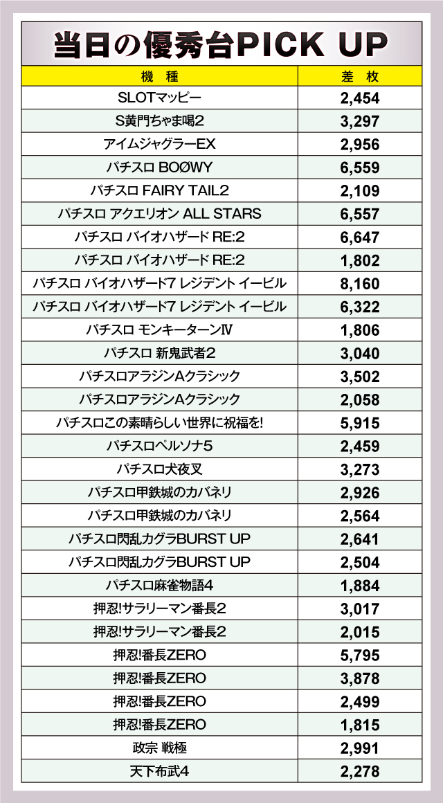 ピックアップ機種では、優秀台としても活躍した『パチスロ アクエリオン ALL STARS』や『バイオ』2機種、『押忍!番長ZERO』が目立っていた。