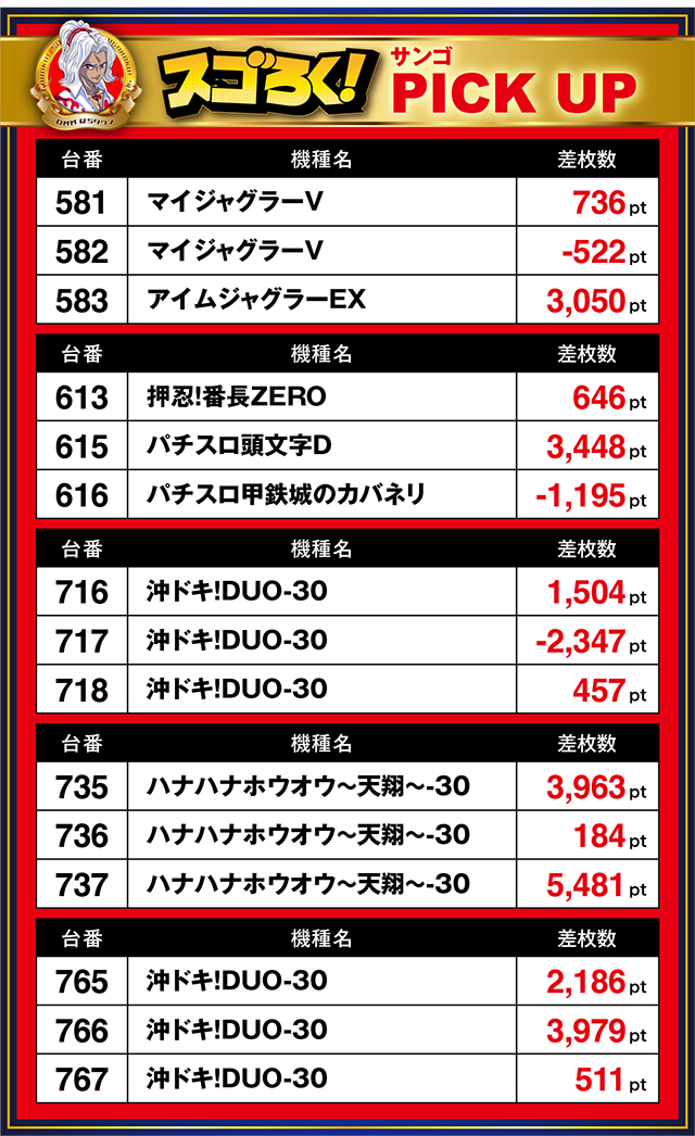 613番台の「押忍!番長ZERO」から616番台までの「パチスロ甲鉄城のカバネリ」も気になった場所のひとつ。真ん中の「パチスロ頭文字D」は、3,000ptオーバーを記録したぜ。