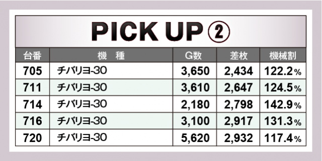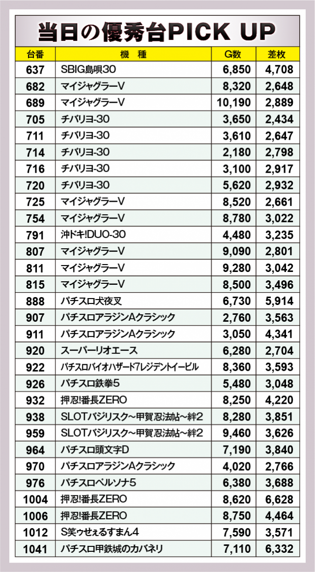 まずは優秀30台のPICK UPから。優秀30台の全てが差枚数+2千枚以上を突破し、そのうち19台が3千枚以上を記録した。後述する好調4機種以外では、1041番台の『パチスロ甲鉄城のカバネリ』が+6,332枚、次いで888番台の『パチスロ犬夜叉』が+5,914枚、さらに637番台の『SBIG島唄-30』が+4,708枚といった好記録が目立ち、その他にもドル箱を積み上げる台が多数見受けられた。