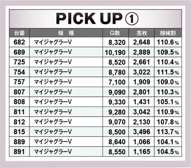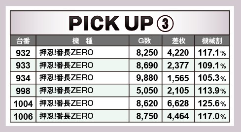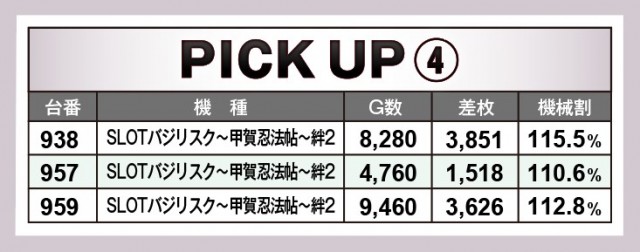 次にこの日の好調4機種に注目。まず『マイジャグラーV』では、3台の+3千枚オーバー台を筆頭に優秀12台合計で+2万8千枚オーバー、次いで『チバリヨ-30』では、優秀5台合計で+1万3千枚オーバーを獲得!この日のトップ差枚数を叩き出した『押忍!番長ZERO』では、1004番台の+6,628枚を筆頭に6台合計+2万1千枚オーバー、さらに『SLOTバジリスク~甲賀忍法帖~絆2』でも3台がピックアップに挙げられ、うち2台が+3千枚オーバーと全幅の信頼を置かれた人気機種たちの活躍が見られ、遊技したファンは相当な満足感を得ていたのではないだろうか。