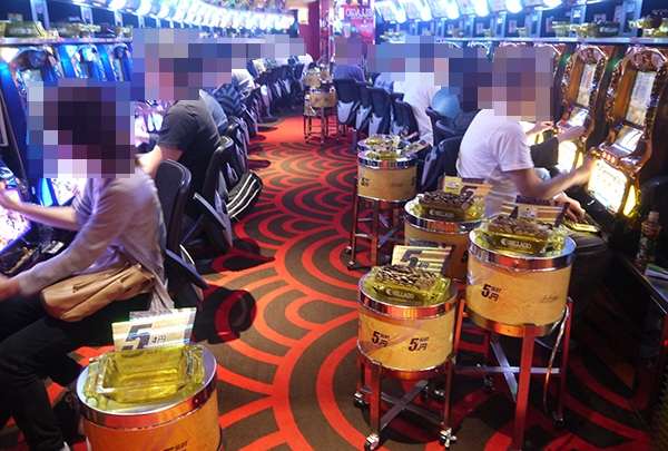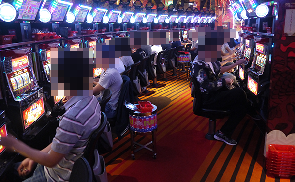 開店時の20円パチスロをみると、「バジリスク~甲賀忍法帖~絆」や「ニューアイムジャグラーEX」など、さまざまな機種が満席。