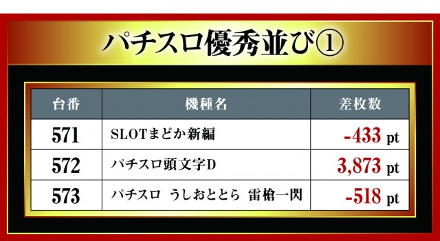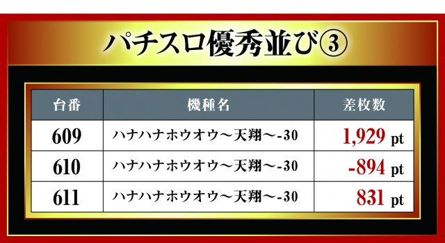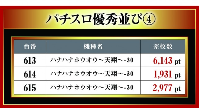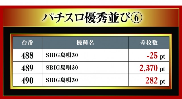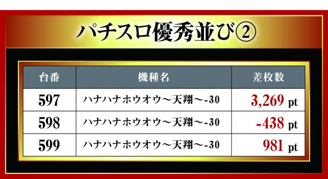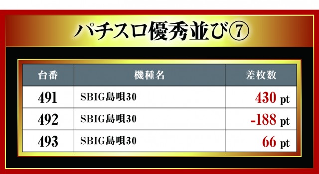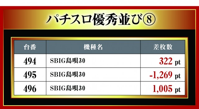 月イチで実施される三重北ウイング4店舗を徹底取材する「はねバト!」。10月1日に実施された「菰野店」のパチスロ3台並びの優秀台をお伝えしていこう。他店舗と同様に3台並びが複数存在する『ハナハナホウオウ~天翔~-30』。中心となっているのには間違いないが、その対抗として現れたのが新機種『SBIG島唄30』!! 今回、早速だが3箇所も3台並びがあったとのことで、いまだ押し引きという面で浸透していないせいか差枚数がしっかり出ていないが、これから注目の機種となるのは間違いない。