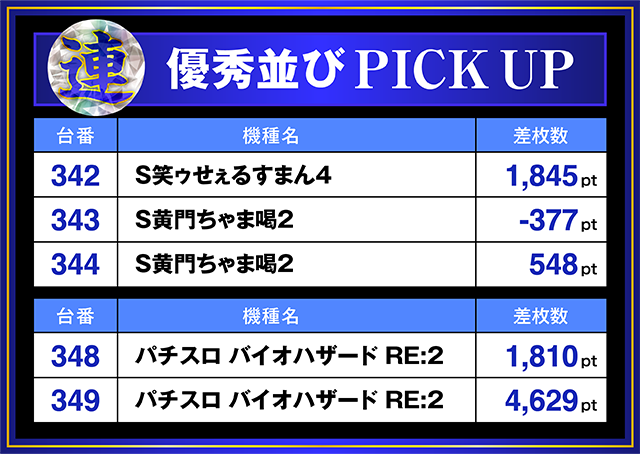 「パチスロ バイオハザード RE:2」の348番台と349番台で、+1,810ptと4,629ptが続いた。