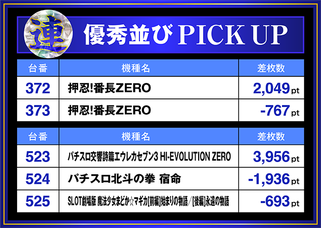 設置台数が9台の「押忍!番長ZERO」は、372番台と373番台の2台が「連」に該当。
