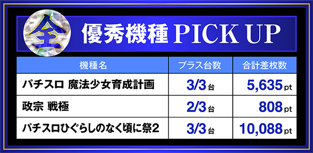 「パチスロ 魔法少女育成計画」も設置されている3台のすべてがプラス。