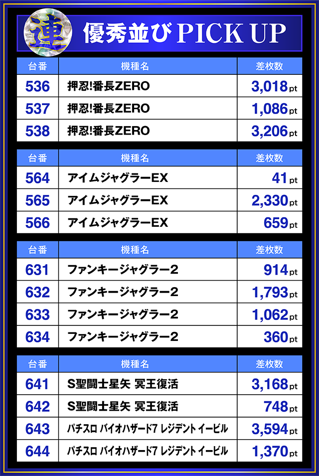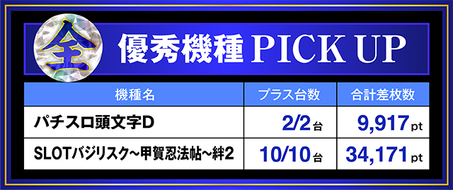 また、+1,000pt超が連なった「押忍!番長ZERO」にも注目。2台が+3,000ptを超えた。