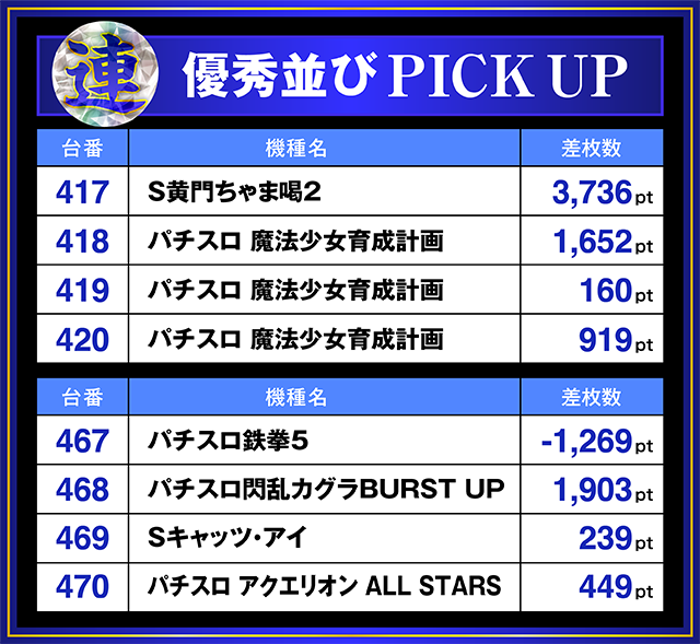 468番台の「パチスロ閃乱カグラBURST UP」から470番台の「パチスロ アクエリオン ALL STARS」まで、3台が続けてプラスとなった。