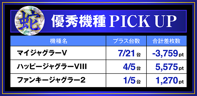 「蛇」の法則は、今までと同様に「マイジャグラーV」でも確認。結果は残せなかったが、気になる台は多かった。