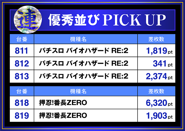 「押忍!番長ZERO」も2台が連続してプラスとなり、818番台は+6,000ptを上回った。