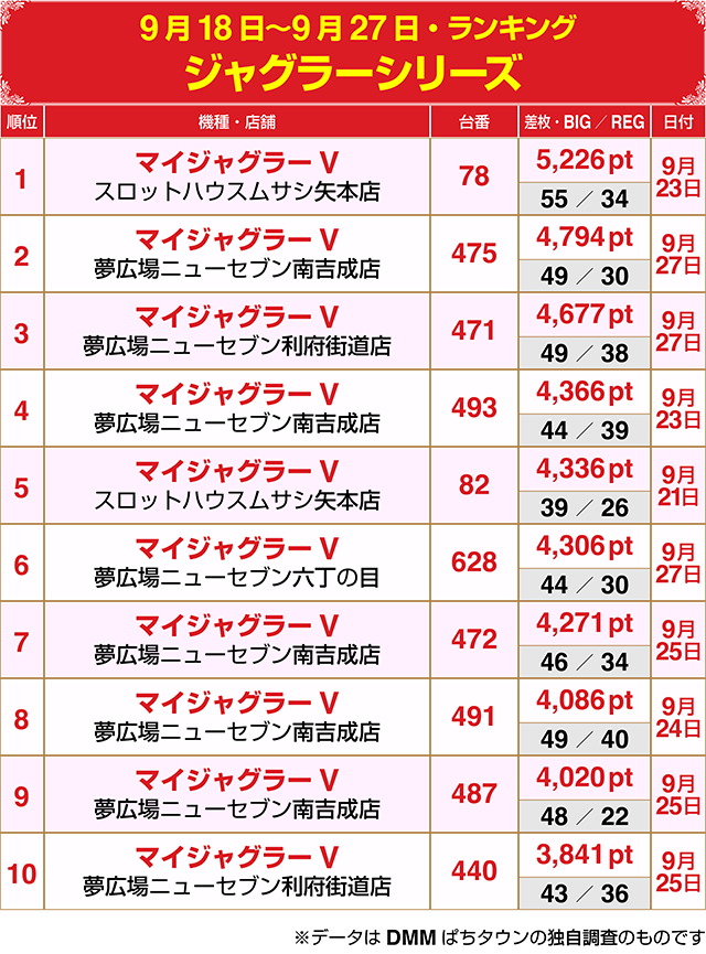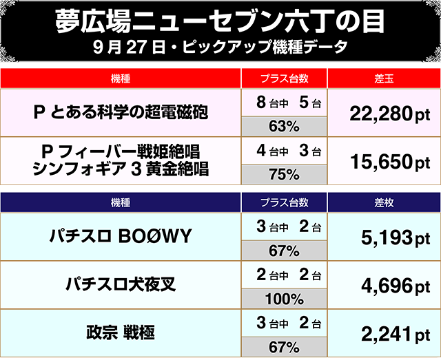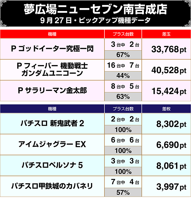 惜しくもランキング外ではあったものの、9月27日の夢広場ニューセブン南吉成店では『アイムジャグラーEX』が全台プラス。