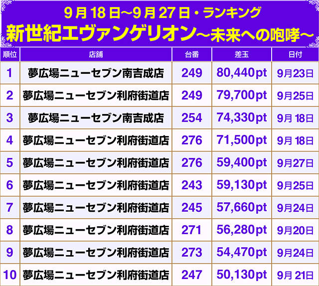 地域最大級の設置台数を誇る『新世紀エヴァンゲリオン~未来への咆哮~』は10台以上が+50,000pt超!