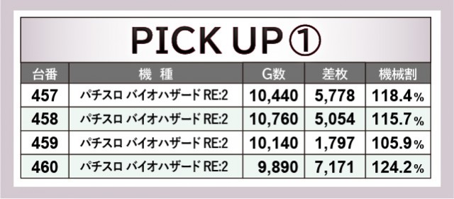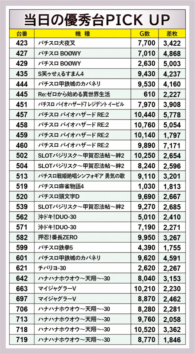 上表の通り、『パチスロ バイオハザード RE:2』『SLOTバジリスク~甲賀忍法帖~絆2』『マイジャグラーV』『ハナハナホウオウ~天翔~-30』の4機種で万回転OVERが発生。さらに7千枚OVERも確認できるなど、朝から閉店に至るまで、活気と熱気に満ちた1日だったことが想像できる。また『パチスロ BOØWY』427番台+4,868枚・429番台+5,003枚と好記録が生まれており、『パチスロ甲鉄城のカバネリ』601番台+4,591枚という数字も見られるなど、目立った活躍を披露していた様子も印象的だ。