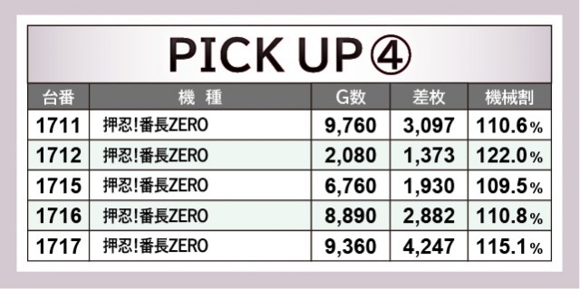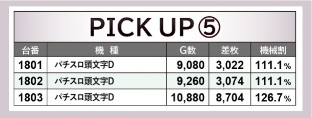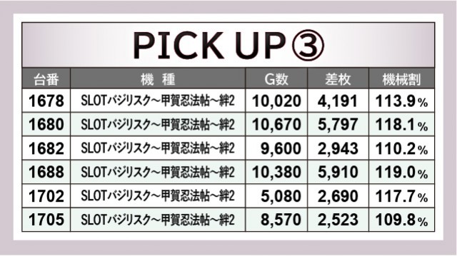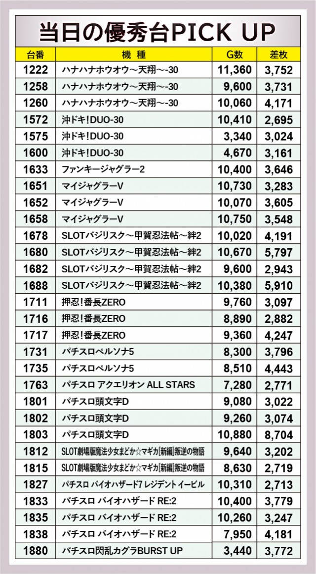 6.5号機が本格的に台頭してきた中、『SLOTバジリスク~甲賀忍法帖~絆2』では1680番台+5,797枚・1688番台+5,910枚という突出した記録が確認できる。また『押忍!番長ZERO』でも1717番台+4,247枚が見られ、まだまだ両機種は現役であることが分かるはずだ。同時に『パチスロ頭文字D』の奮闘も目を見張るものがあり、1803番台+10,880G・+8,704枚という記録には、多くの羨望の眼差しを集めていたことだろう。