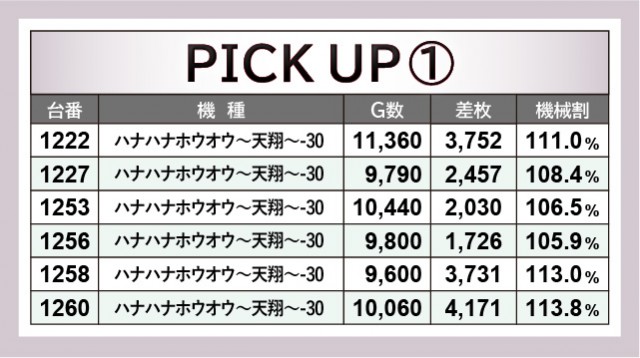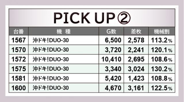 『ハナハナホウオウ~天翔~-30』『沖ドキ!DUO-30』の沖スロ両機種は、ともに万回転OVERが発生。それでいて1260番台+4,171枚を筆頭に2~3千枚OVERが見られるなど、活気だけでなく熱気にも満ちていた様子が窺える。またファンからの厚い信頼を集めていることもハッキリと分かり、今後も同店の盛り上がりをリードしてくれる存在なのは間違いない。