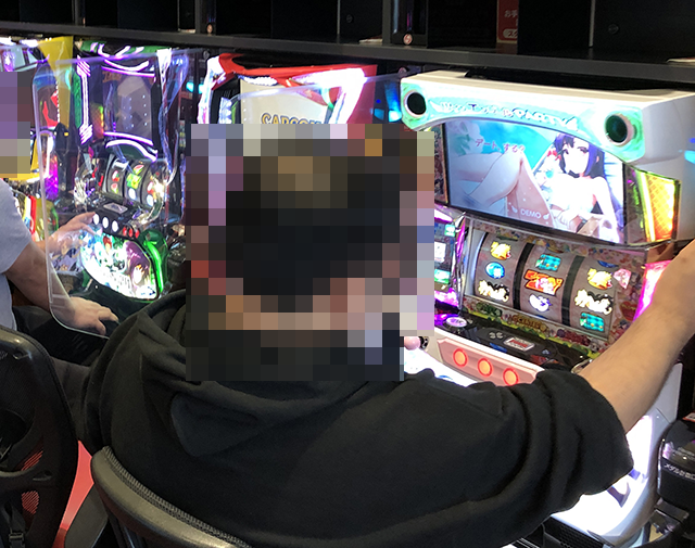 となりに並ぶ「パチスロ ゼーガペイン2」と「パチスロツインエンジェルPARTY」にも、うれしそうに遊技をおこなっている姿があった。