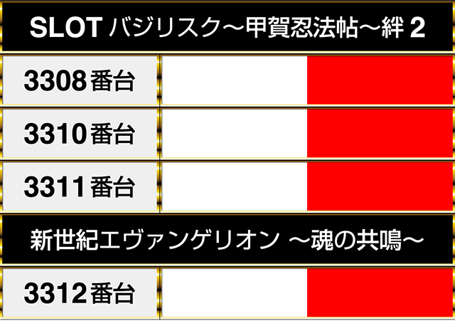 『SLOTバジリスク~甲賀忍法帖~絆2』の3台と『新世紀エヴァンゲリオン 〜魂の共鳴〜』の1台が並んでプラスpt!!