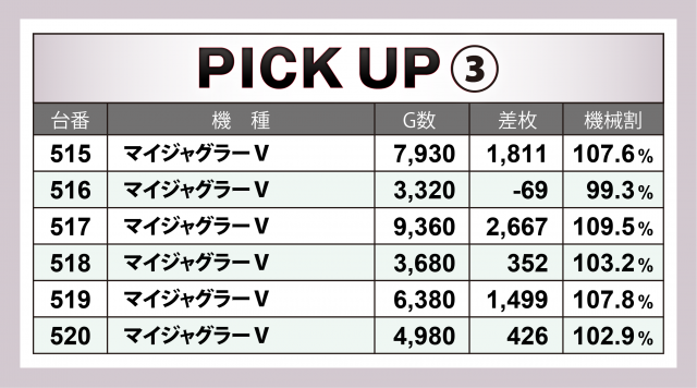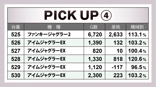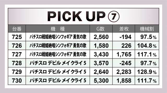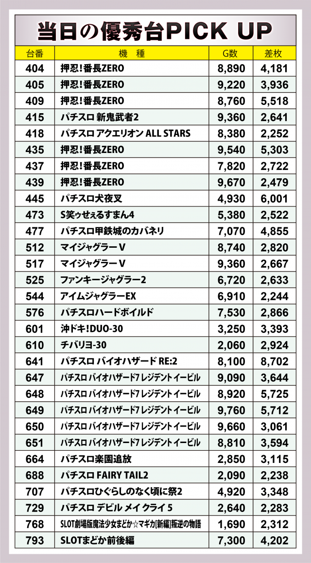 まずは優秀30台のPICK UPから。この日は30台全てが差枚数+2千枚以上を達成、+3千枚以上が16台と過半数超え、+4千枚オーバーが9台、+5千枚オーバーが6台とハイレベルの出玉に! いずれも劣らぬ成績で、後述する横並び好況スポット以外では+6千枚を超えた『パチスロ犬夜叉』、+5千枚に迫った『パチスロ甲鉄城のカバネリ』、+4千枚オーバーとなった『SLOT劇場版 魔法少女まどか☆マギカ[前編]始まりの物語/[後編]永遠の物語』が特に優秀なスコアを残した。