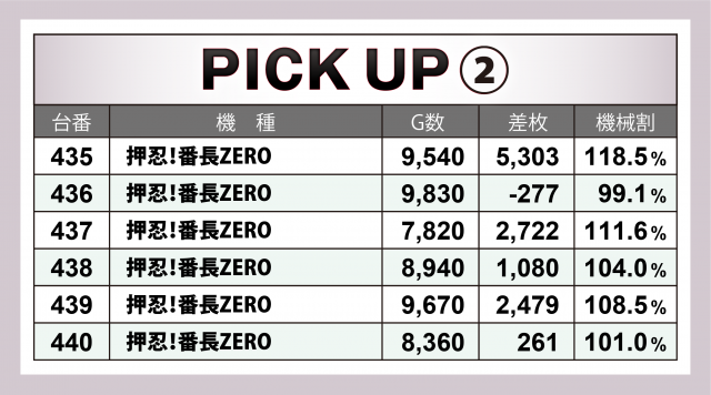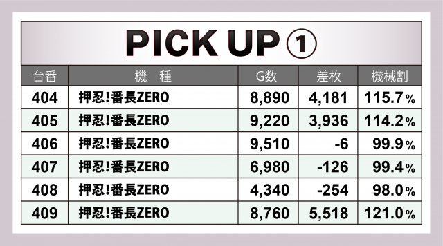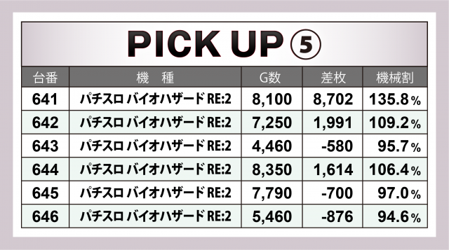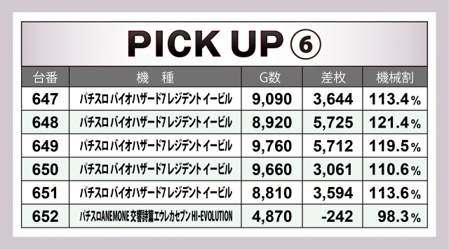 続いては7箇所6台ずつ計42台の横並び好況スポットについて。マイナス台を出しながらもいずれの並びも好調台が連発、特に際立ったのは『パチスロ バイオハザード RE:2』『パチスロ バイオハザード7 レジデント イービル』のシリーズ2機種で、前者は+9千枚到達間近が1台・後者は+5千枚オーバーが2台という結果を刻んだ。その他『押忍!番長ZERO』12台では+5千枚台×2・+4千枚台×1・+3千枚台×1・+2千枚台×2とこちらも盛況だった。