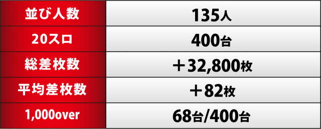 この日[1000円/46枚] スロ全400台は、前回から1万枚以上アップしたトータル差枚数+32,800枚で終了。また1,000overも前回より20台以上も上昇、全体の2割弱となった。これでトータルプラス6連勝、どんどんと好記録を更新し続けていって欲しい!