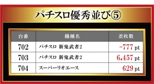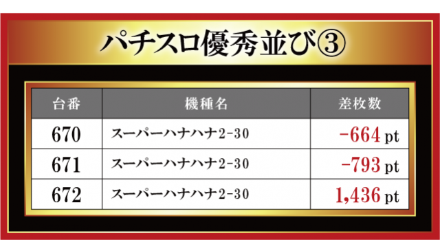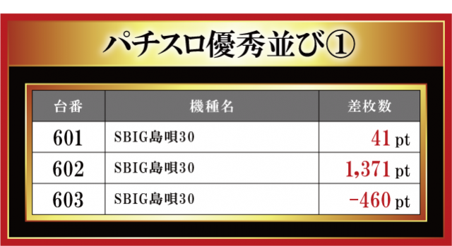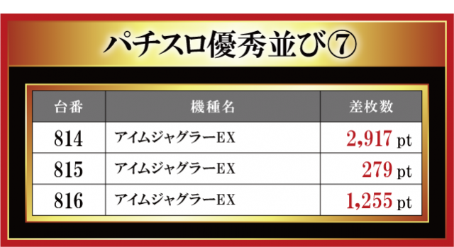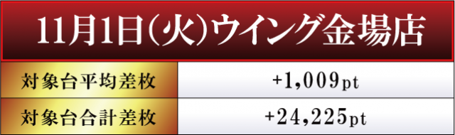 恒例となった月イチ実施の「はねバト!」。11月1日に実施された「金場店」のパチスロコーナーの模様をお伝えしていこう。やはり今月も沖スロとジャグラーシリーズの3台並びが散見されている。沖スロだけでなく、ジャグラーもしっかり盛り上げるという金場店ならではの特徴が見て取れると言ったところだ。その他、6.5号機勢にも注目。『パチスロ 新鬼武者2』と『パチスロハードボイルド』でしっかりとした差枚数が飛び出ている。トレンドにも手が届いている金場店はまさに抜け目なしと言えよう。
