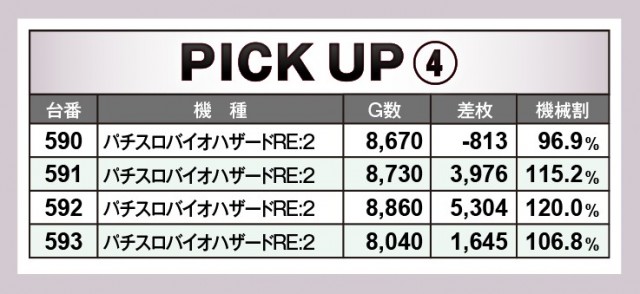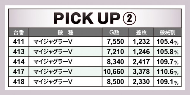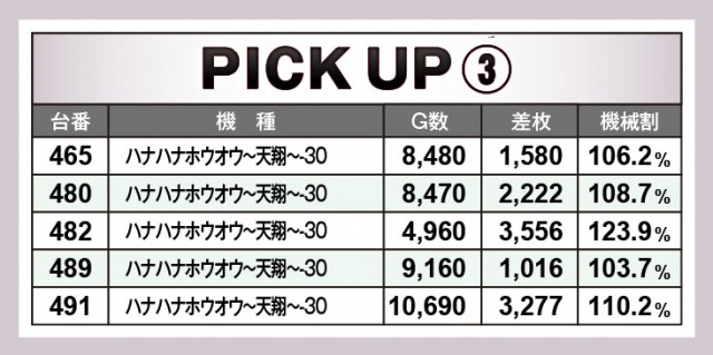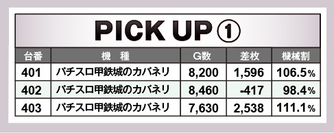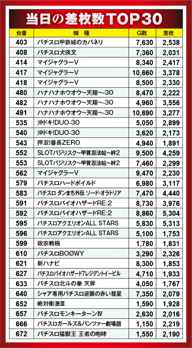 まず、6.5号機から『パチスロ甲鉄城のカバネリ』では全3台中2台で好調ぶりが見られた。次に『マイジャグラーV』では、417番台の+3,378枚を筆頭に+1,000枚オーバーが多くみられ、『ハナハナホウオウ~天翔~-30』では+3,000枚オーバーが2台あり、ピックアップ5台のトータル差枚数は+11,000枚オーバーとなった。『パチスロバイオハザードRE:2』では、全4台中3台がプラスとなり、592番台が+5,304枚の大台を突破し、トータル差枚数は+10,000枚オーバーを獲得!