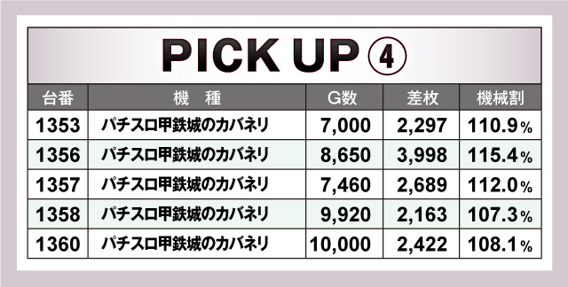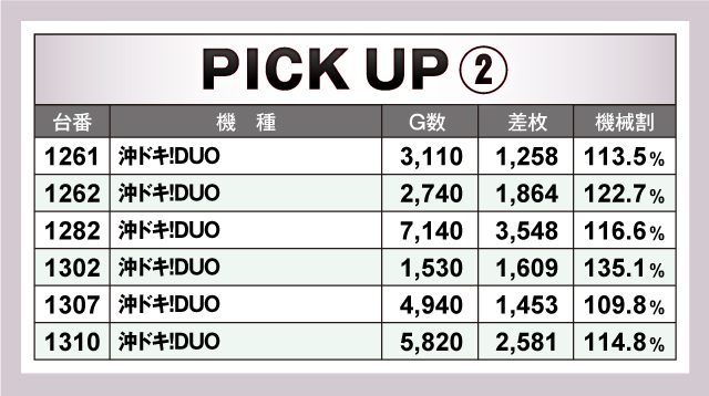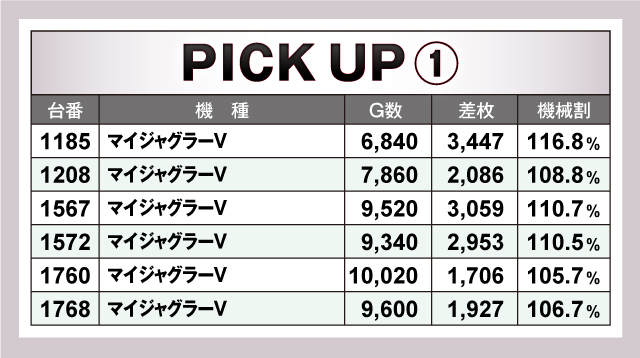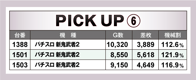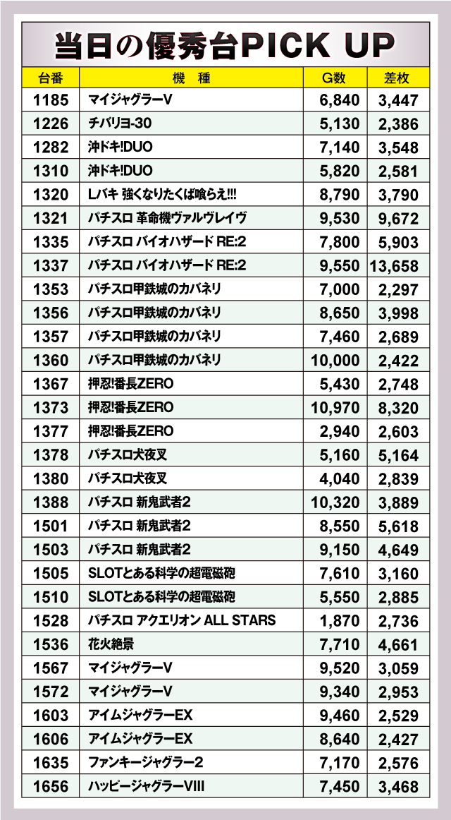 今回ピックアップしたのは、「マイジャグラーV」「沖ドキ!DUO-30」「パチスロ バイオハザード RE:2」「パチスロ甲鉄城のカバネリ」「押忍!番長ZERO」「パチスロ 新鬼武者2」の6機種。いずれの機種も差枚は全台4ケタオーバーで、回転数もしっかり回されていたことからも、遊技していたファン達も確信して回していたことが分かる。諦めずに台を探せば、きっと良台に辿り着くだろう!