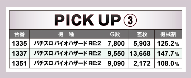 まずは優秀台ピックアップから。「パチスロ バイオハザード RE:2」の+13,658枚という超絶記録を筆頭に、ハイパフォーマンスを見せた台が大量出現! また、スマスロや6.5号機、ジャグラーなど、全体的に幅広い機種がランクインしており、満遍なく力を入れている傾向が見て取れる。