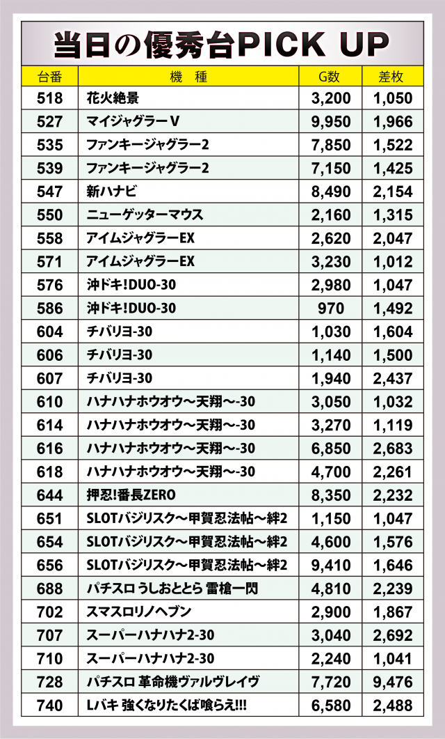 まずは優秀27台のPICK UPから。定例では1,000overの30台に迫るのだが、今回はその数に満たなかったのは残念だった。27台のうち10台が差枚数+2千枚以上を達成した。後述する好調マシン2機種以外では、何と言ってもスマスロの『パチスロ 革命機ヴァルヴレイヴ』が+1万枚間近となったのが今回の最高記録だった。その他では、3台トータルで+4千枚を突破した『SLOTバジリスク~甲賀忍法帖~絆2』、2台の合計で+4千枚に迫った『スーパーハナハナ2-30』が好成績を残した。