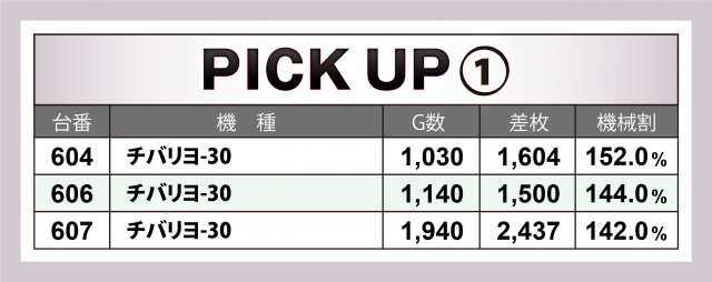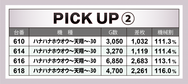 続いては当日に好調だった30パイマシン2機種7台をチェック。7台全てが4桁のプラス差枚数を達成、『チバリヨ-30』『ハナハナホウオウ~天翔~-30』のそれぞれで+2千枚オーバー台を輩出した。