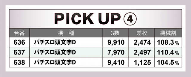 続いては横並び好況スポット4機種12台をチェック。まずは『SLOT劇場版 魔法少女まどか☆マギカ[前編]始まりの物語/[後編]永遠の物語』に注目すると、4台全てがプラス&+4千枚オーバー台を輩出。その他では『パチスロ バイオハザード7 レジデント イービル』に+3千枚突破台、『パチスロ頭文字D』は3台トータルで+6千枚超え、『パチスロコードギアス 反逆のルルーシュ3』では+2千枚台×2といった記録を残した。