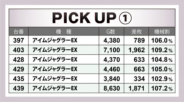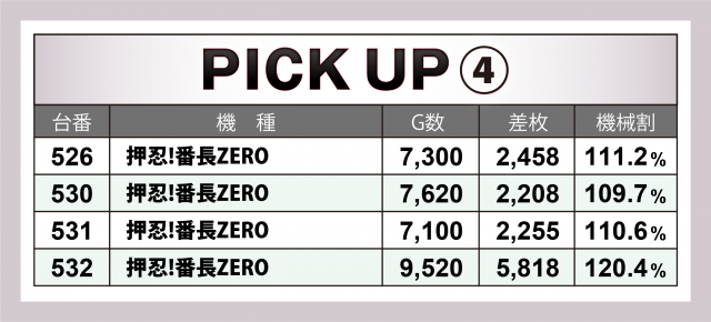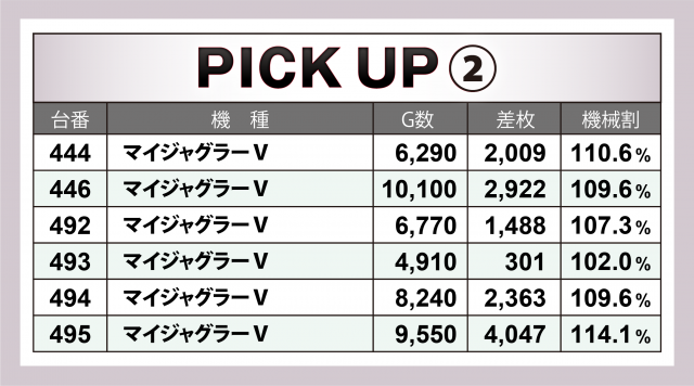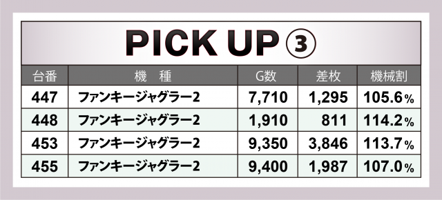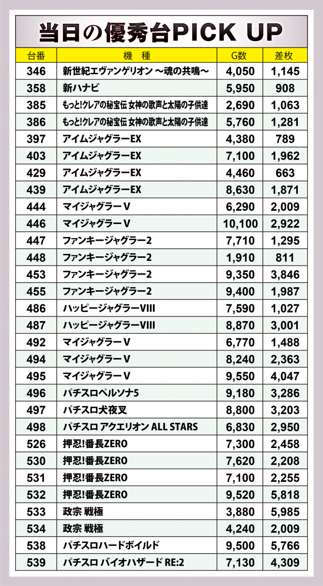 続いては好調4機種20台をチェック。前日の取材と同じラインナップとなり、最も優秀だったのが『押忍!番長ZERO』。+6千枚弱の台をトップに4台合計で+1万2千枚超を記録した。その他、『マイジャグラーⅤ』『ファンキージャグラー2』それぞれで+4千枚クラスの台を輩出される結果に。