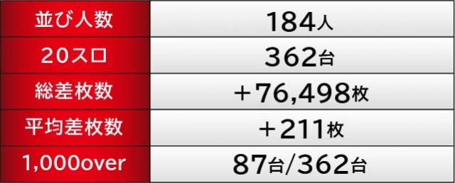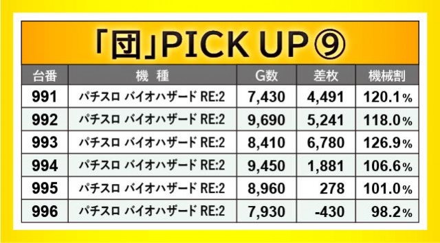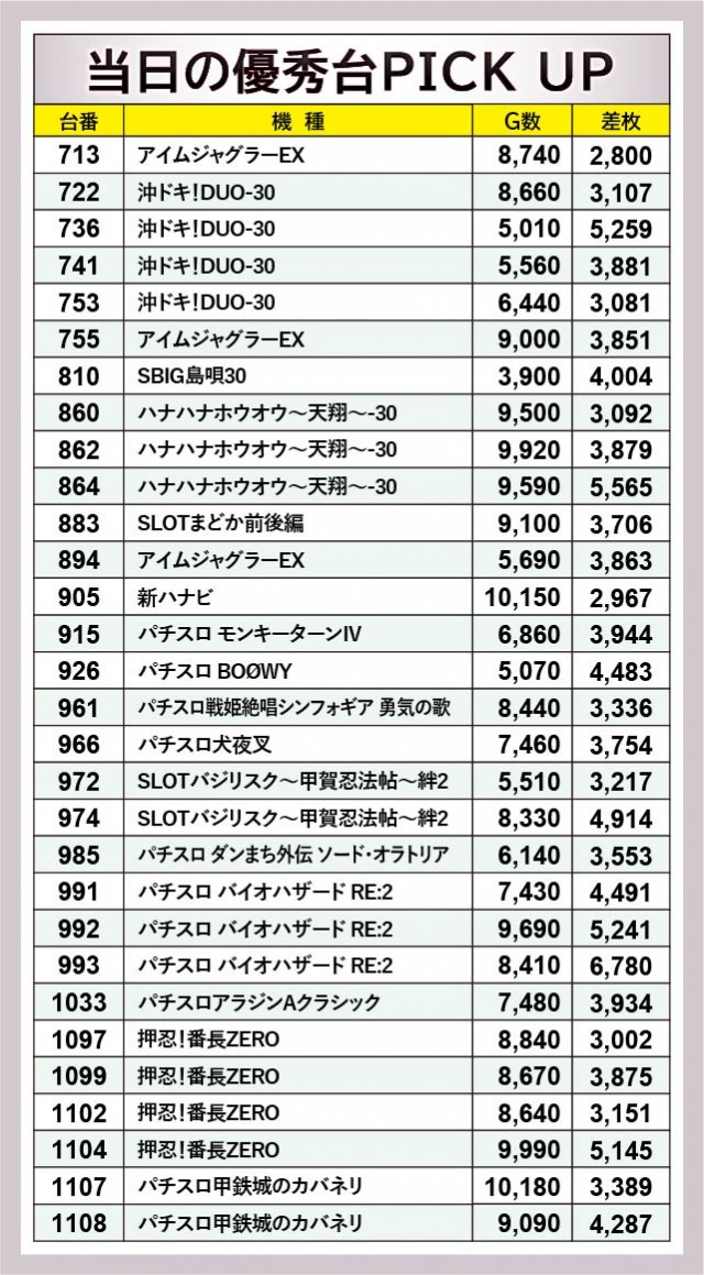 横並びの好況スポットが10ヶ所も確認できた当日、特に存在感を放っていたのが『パチスロ バイオハザード RE:2』だった。992番台+6,241枚・993番台+6,780枚という大台突破台を確認でき、凄まじい熱気が放たれていたのが印象的だ。一方で沖スロから『沖ドキ!DUO-30』736番台+5,259枚『ハナハナホウオウ~天翔~-30』864番台+5,565枚という記録も飛び出し、各所で大きく盛り上がっていた1日だった。