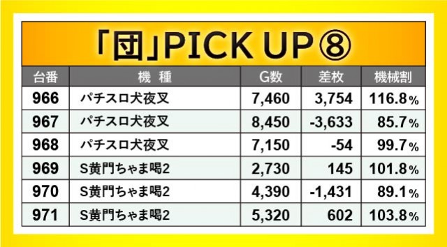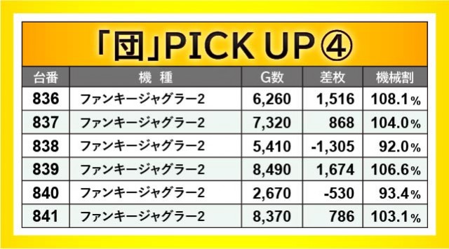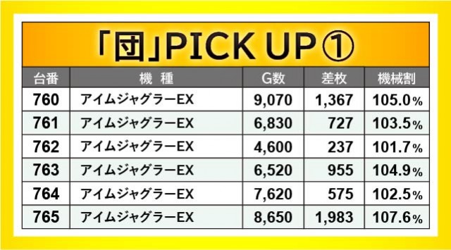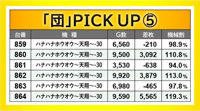 ノーマル機では760~765番台・836~841番台・859~864番台の3ヶ所、沖スロは793番台~798番台・818~823番台の2ヶ所で好況スポットが形成されていた。前者はいずれも多くのゲーム数が消化され、右肩上がりのグラフを描いていたのが目に焼きつく。沖スロもまた粘り強く戦った形跡があり、遊技するファンは有意義な時間を過ごしていたことだろう。