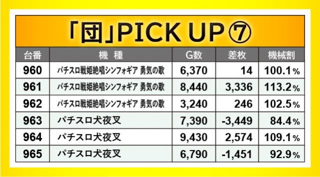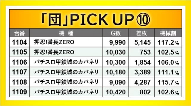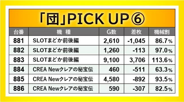 AT機群では881~886番台・960~965番台・966~971番台・991~996番台・1104~1109番台にて好況スポットが形成されていた。『パチスロ バイオハザード RE:2』にて3台の大台突破台を確認でき、他にも『SLOT劇場版 魔法少女まどか☆マギカ[前編]始まりの物語/[後編]永遠の物語』883番台+3,706枚や『パチスロ戦姫絶唱シンフォギア 勇気の歌』961番台+3,336枚、『パチスロ犬夜叉』966番台+3,754枚といった記録も見逃せない。また『押忍!番長ZERO』1104番台+5,145枚や『パチスロ甲鉄城のカバネリ』1108番台+4,287枚という記録もあり、各所でしっかりと熱気が放たれていた印象だ。