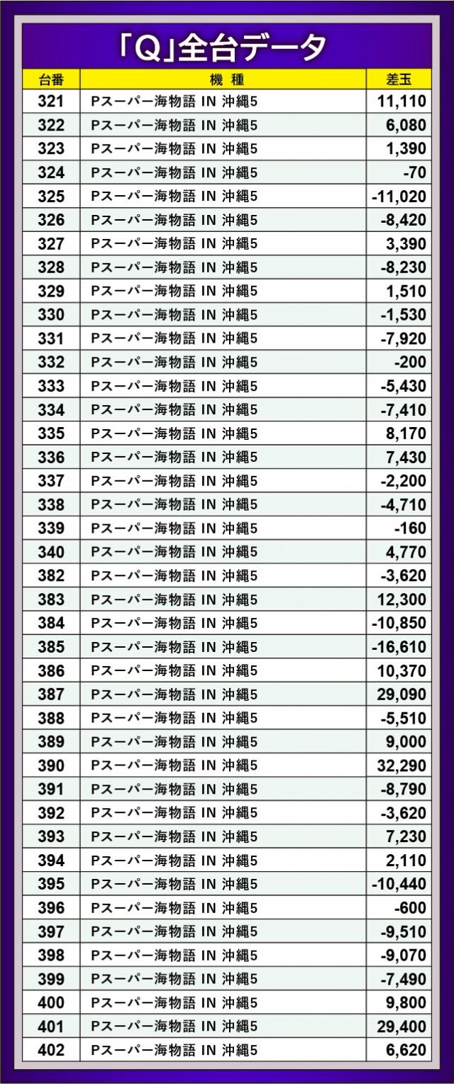 いつの時代も変わらない人気を集める『Pスーパー海物語 IN 沖縄5』では、コンスタントな大当りに加えて、複数の万発OVER台を確認できた。387番台+29,090玉・390番台+32,290玉・401番台+29,400玉の3台が突出した存在感を放っており、その他の台も触発され、島全体が活気と熱気に満ちていたと言える。