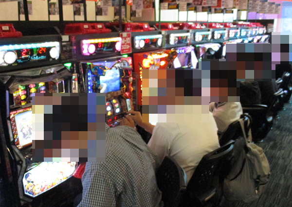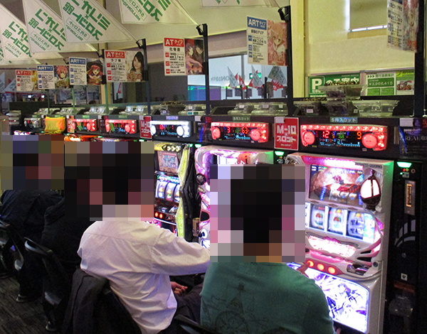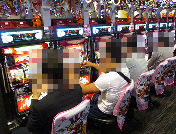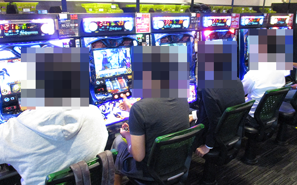 16時頃の20円パチスロでは、朝から引き続き「バジリスク~甲賀忍法帖~絆」が大人気。プレイヤーのにこやかな笑顔からは、満足度の高さもうかがえた。