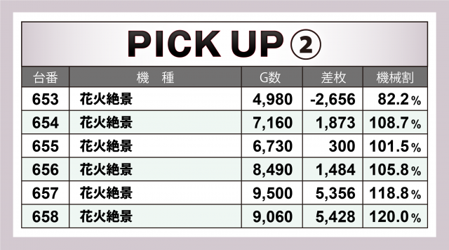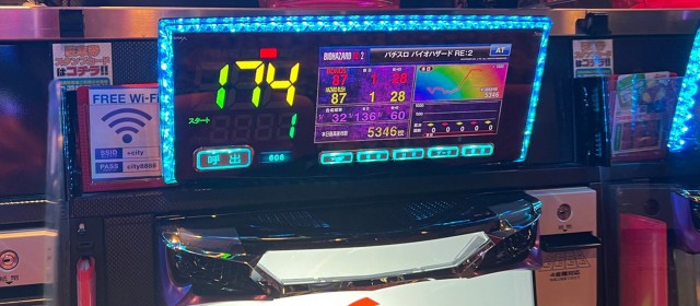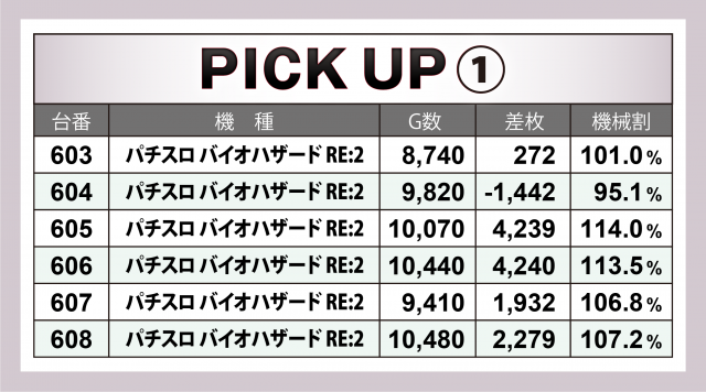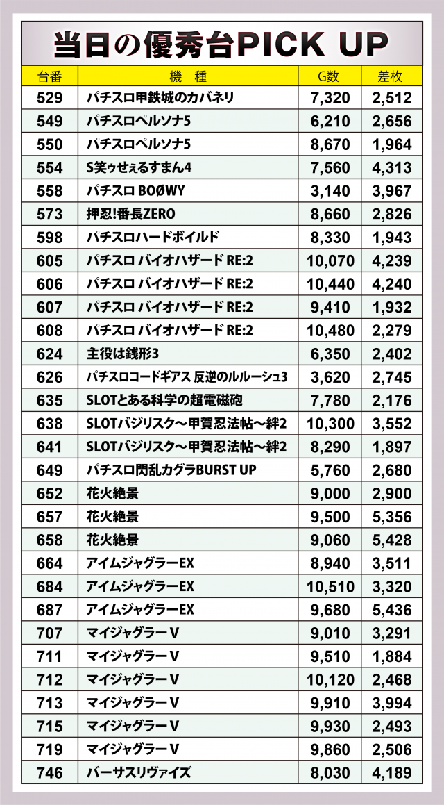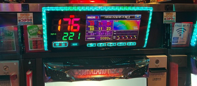 続いては横並びで好調だった3機種6台ずつに注目。いずれもマイナス台がありつつもハイスコア台を輩出。+5千枚オーバーが2台生じた『花火絶景』、4千枚突破台×2の『パチスロ バイオハザード RE:2』、+4千枚弱×1台&+2千枚×2台の『マイジャグラーⅤ』、それぞれがアツいスポットと化していた。