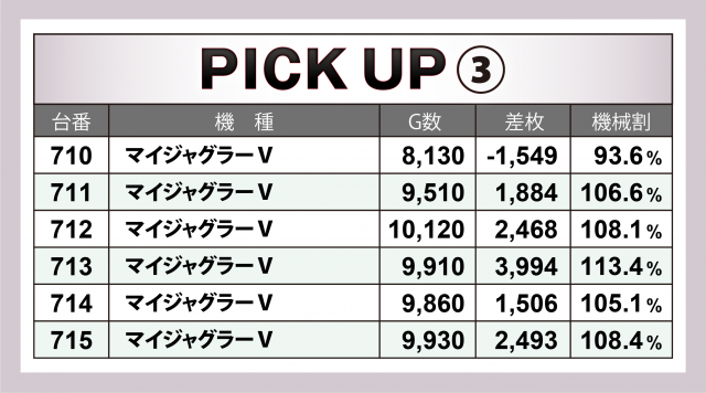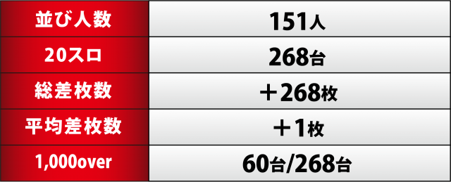 今回、[1000円/46枚] スロ全268台のトータル差枚数は+268枚と薄氷を踏むような数値かつ前回を上回ることができなかったが、とにかくプラスを維持したことは喜ばしいこと。一方、1,000overは全体の2割を超え、前回より20台近くと大幅に上昇した点は良い傾向と言えるだろう。次回取材時は、4連勝を賭けて史上最高の好成績を叩き出して欲しい!