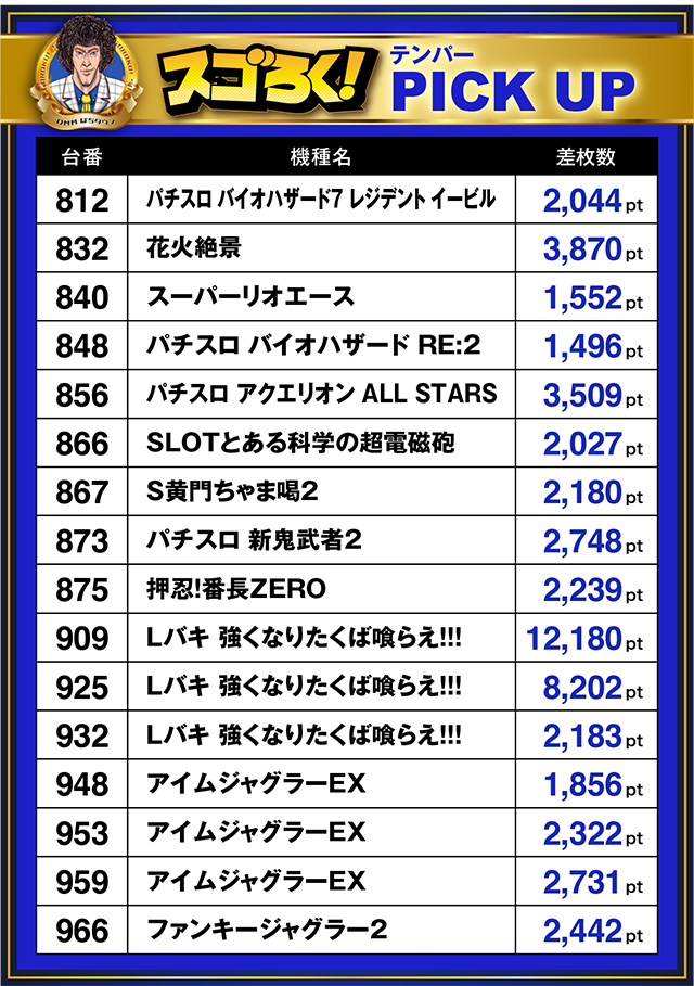 932番台も2,000ptを超えるなど、各プレイヤーが遊技を満喫していたみたいだな。