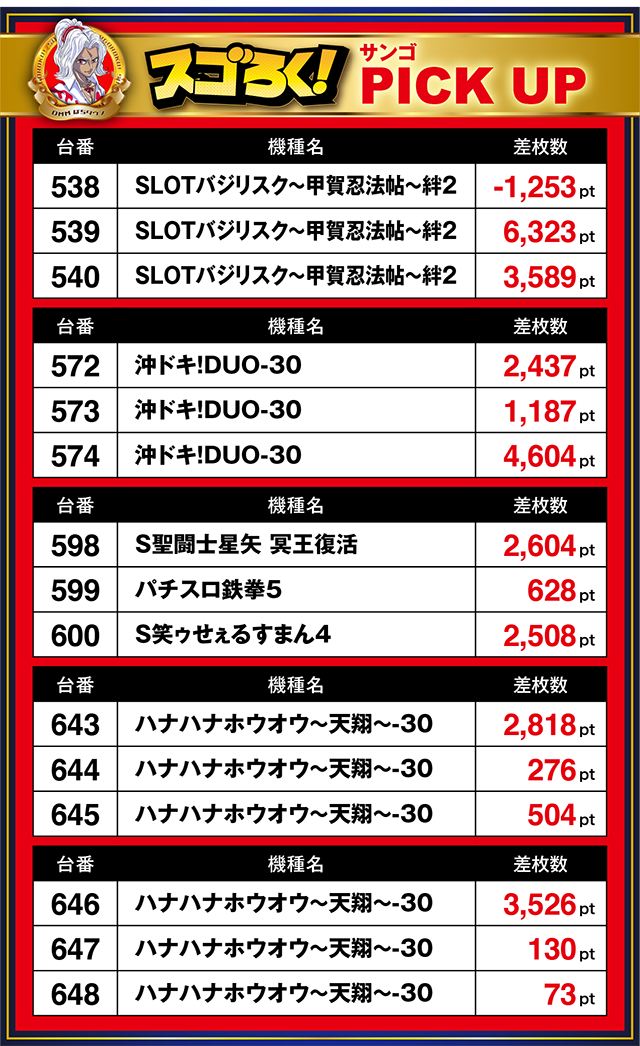 結果は全台がプラス! 2,800pt以上や3,500pt以上となった台もあったよ。