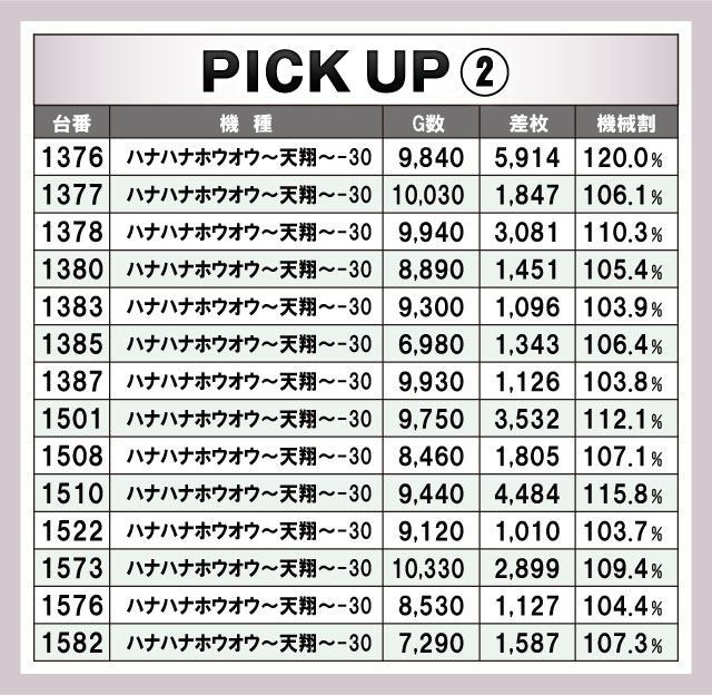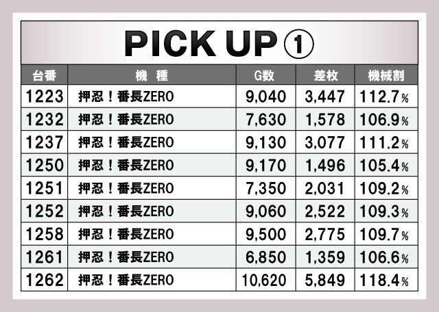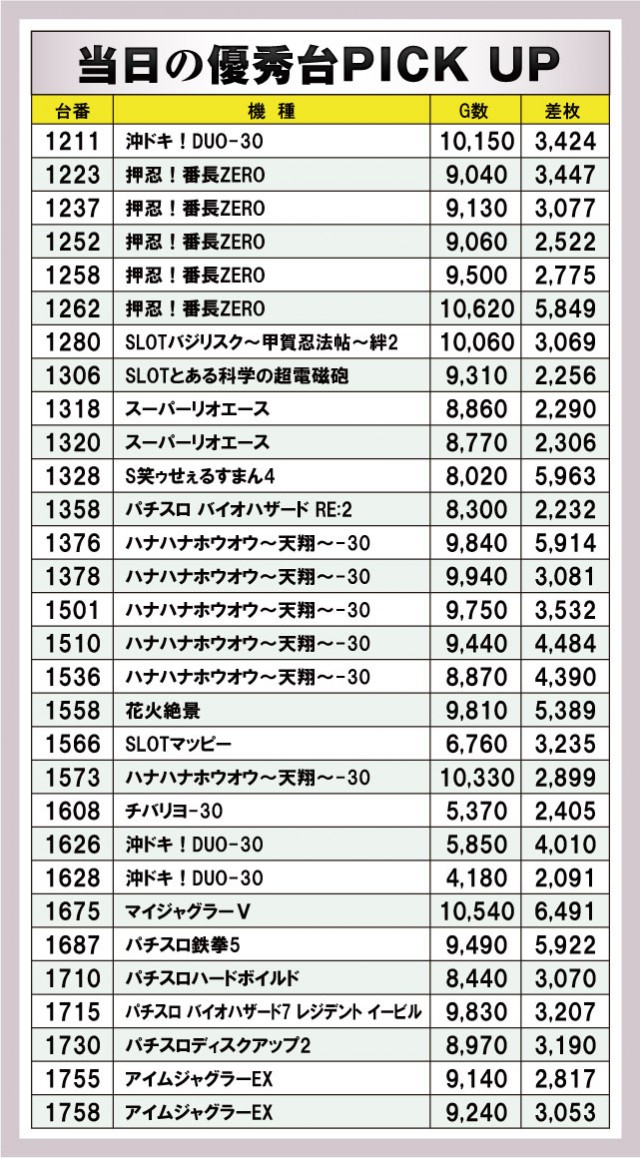 まずは今回の優秀台からご覧いただこう。上表では高設定台でないと成し得ない差枚数の台が結果として出ている。ノーマルタイプの代表格は『ハナハナホウオウ~天翔~-30』、AT機の代表格は『押忍!番長ZERO』。それぞれ5台ずつ優秀台としてピックアップされている。そして、差枚数のトップは『マイジャグラーⅤ』! こちらは+6,491枚となっており、最高設定でないとその差枚数に到達しないだろうといわんばかりの最優秀台となった。その他、今回の優秀台はご覧の通りとなっている。