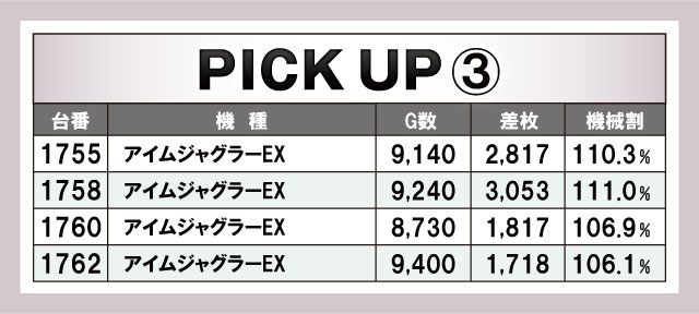 今回の結果をさらに細かく分析するピックアップのコーナー。今回は3か所となっているが、さきほどもご紹介した番長とハナハナをさらに拡大してプラス差枚数となっている台が並んでいる。どの台がどれくらい出ていたのか。機械割を含めてさきほどよりもより詳細に記載してあるので、しっかりとチェックしておこう。なお、『アイムジャグラーEX』のプラス差枚数台はご覧の通りとなっている。