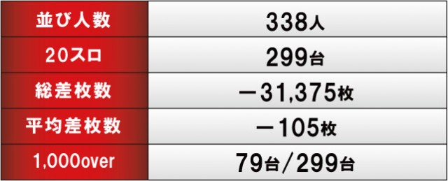 さて、優秀台をご覧いただければ、かなり景気の良い差枚数の台があちらこちらの機種から出ていたので、さぞかしトータル差枚数も景気が良いことだろうと思われがちだが、冒頭にも掲載してある通り、なんと今回の差枚数は-31,375枚となっており、今年初の黒星となってしまった。やはり稼働率が高い『DAMZ竹尾インター本店』なので、高設定の数が多くなければ結果としてそうなってしまうもの。たがしかし、今回の優秀台が示す通り、必ず高設定台があるのは確か。それを仕留めるべく、今回の結果を参考にして次回はどの台に入りそうかなどの考えていくことが肝要だ。それに加えて『DAMZ竹尾インター本店』がトータル差枚数がプラスとなるようにリベンジも願うばかりである。