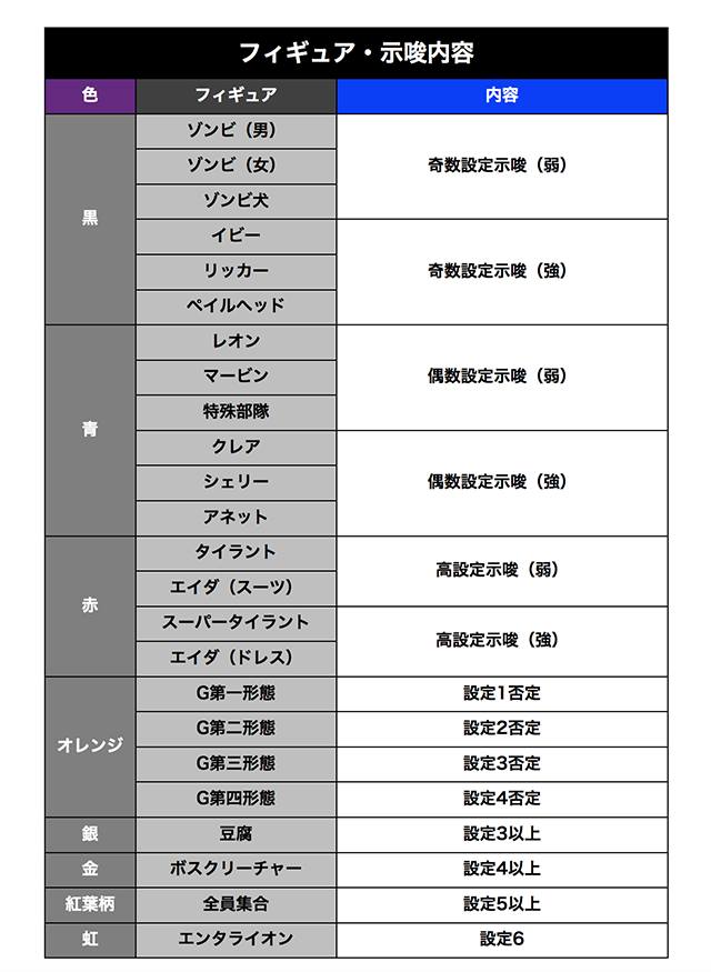 ボーナス終了時とエンディング中のレア役成立時に、サブ液晶に出現するフィギュアで設定を示唆する。