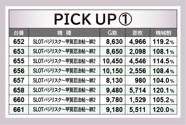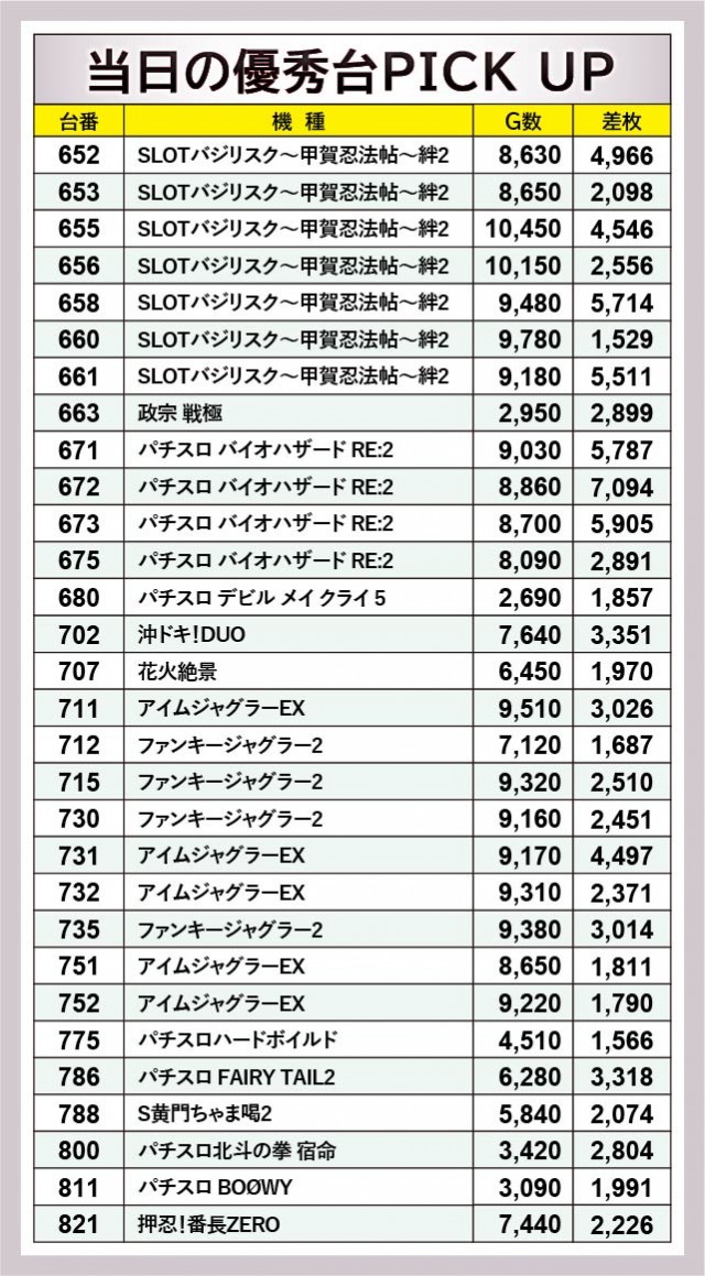ピックアップした30台の優秀台を見れば、機種単位での活躍が目立っていることが分かる。こと『SLOTバジリスク~甲賀忍法帖~絆2』に関しては4~5千枚OVERが確認でき、万回転OVERも発生する大盛況ぶりを披露していた。また『パチスロ バイオハザード RE:2』672番台+7,094枚が記録されるなど、凄まじい熱気を放っていたのも見逃せない。『ジャグラー』シリーズの安定した活躍もあって、各所でドル箱に手を伸ばすファンの姿が多かったのも好感を覚えるポイントだ。
